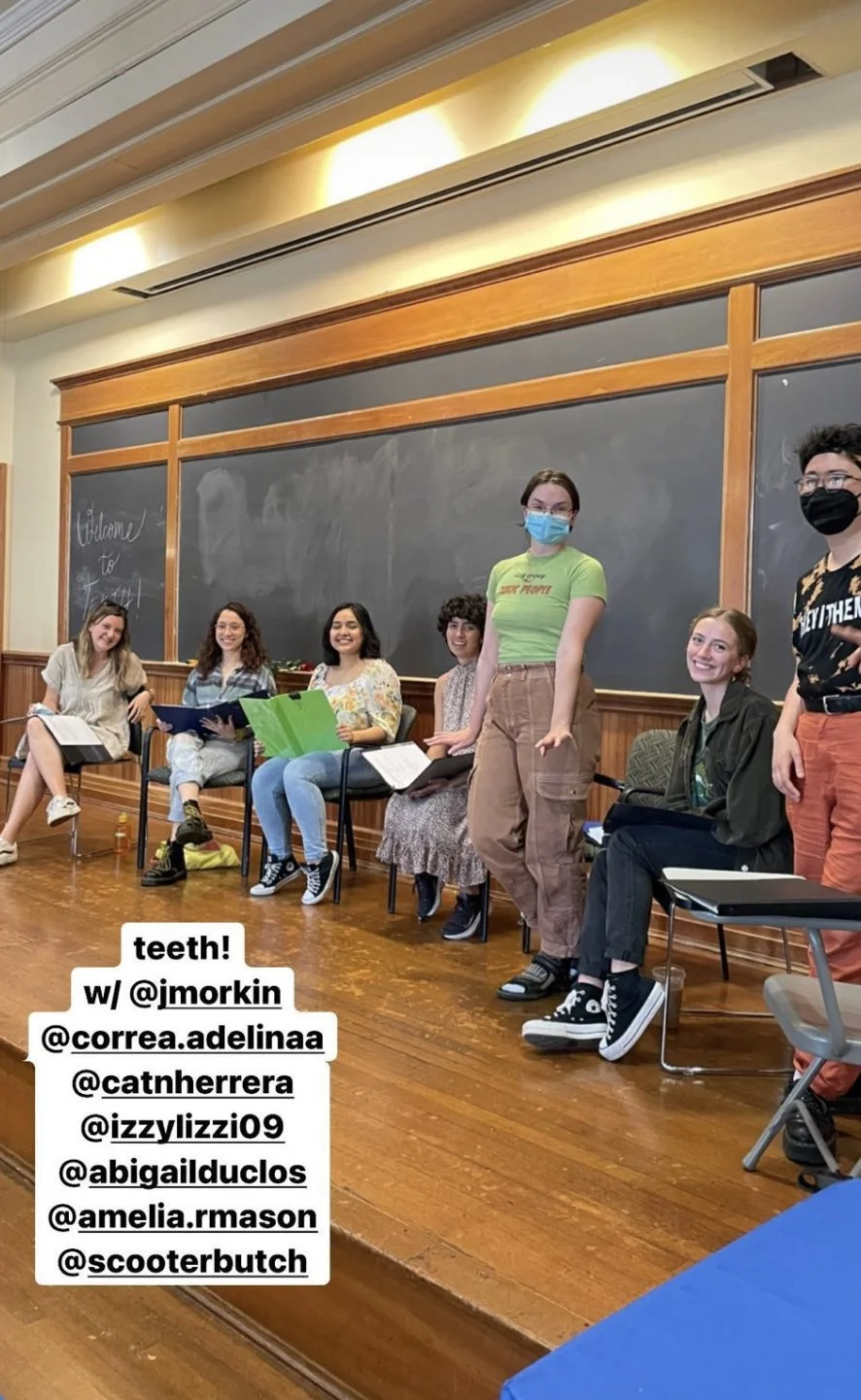 Teeth was first performed as a staged reading on May 5, 2022, in Barnard Hall, as part of a festival of student-written work sponsored by Columbia NOMADS.