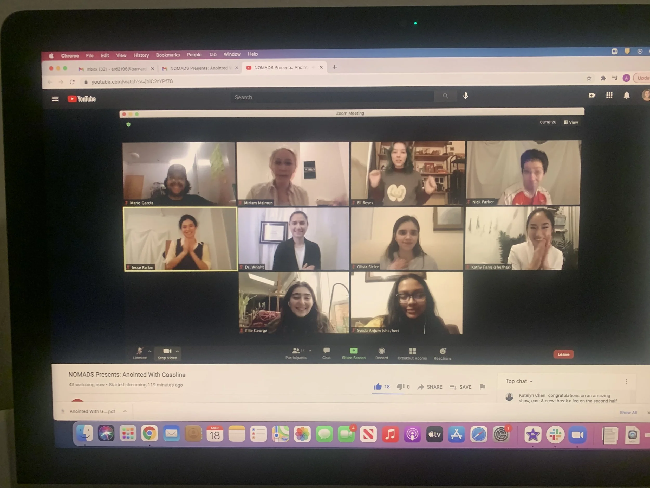 Anointed With Gasoline was produced NOMADS, an organization at Columbia University dedicated to producing student-written work. It was produced as a staged reading on December 4, 2020, and as a fully-developed main-stage show from March 18-20, 2021.